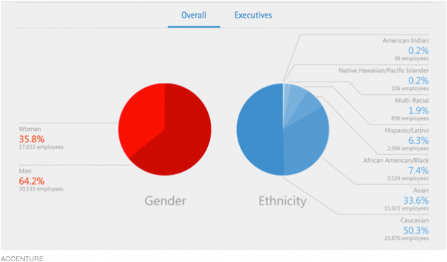 Accenture 's demografía se ven un poco mejor que lo que hemos estado viendo en tecnología: Sesenta y cuatro por ciento de los empleados son hombres. La mitad son blancos, el 34 por ciento de Asia, un 7 por ciento por ciento afroamericanos e hispanos 6. La compañía es menos diversa en el nivel ejecutivo - 63 por ciento de los ejecutivos son blancos y el 69 por ciento son hombres.