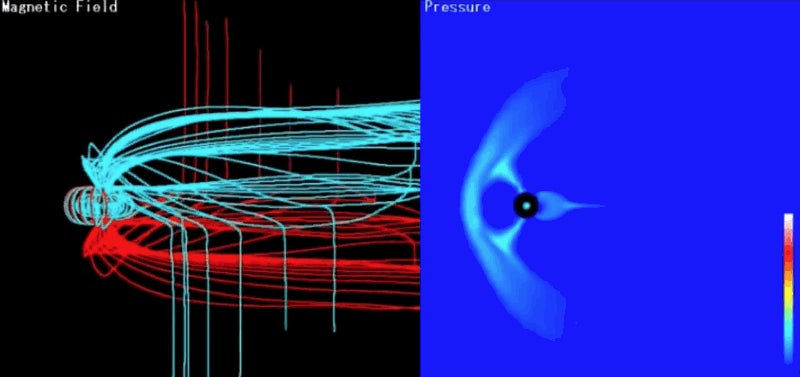 El campo magnético del sol, o heliosfera, presiona continuamente contra nuestra magnetosfera. La tensión entre ambos campos es dinámica, y hace que las fronteras del campo magnético se muevan y choquen de forma violenta liberando calor y partículas. Esas colisiones afectan, por ejemplo, a los corrientes de electrones que rodean nuestro planeta y a las auroras boreales.