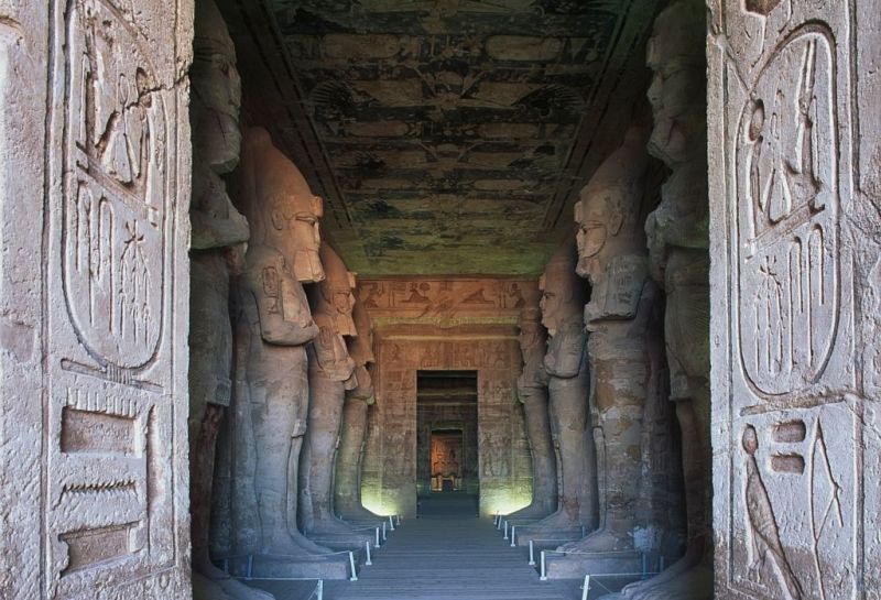 (entrada cubierta) hacia un antiguo templo egipcio.